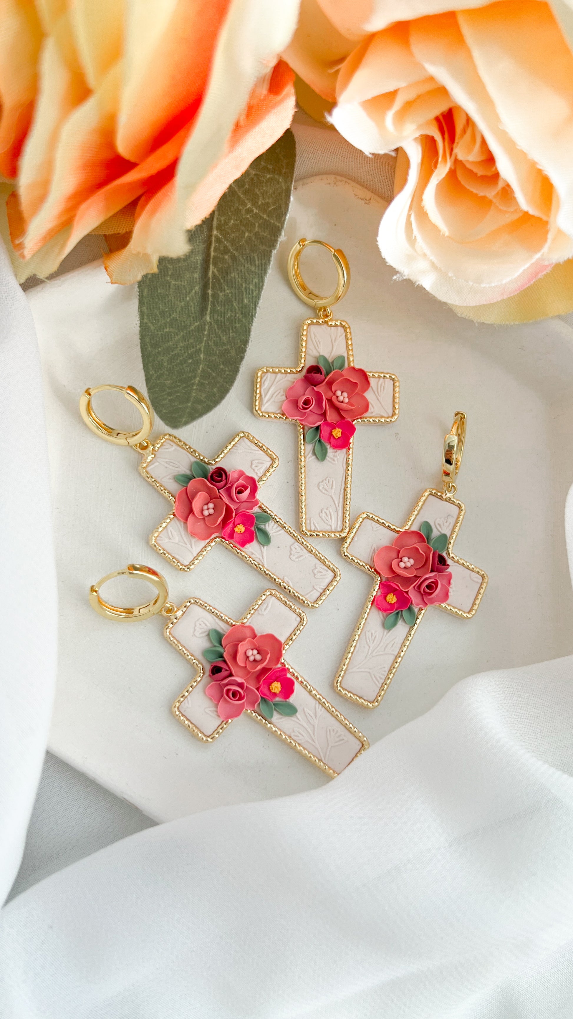 Handmade polymer clay cross earrings. Gold colored rimmed borders with florals in pinks and peach.